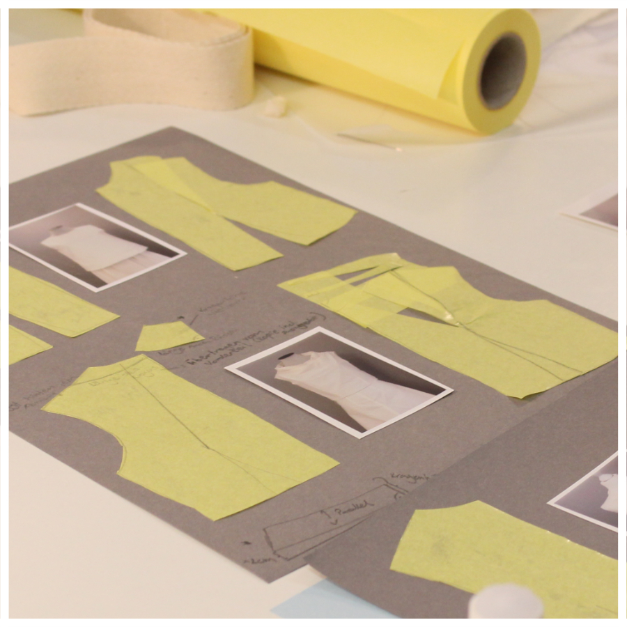 Für die 1:1 Modellgestaltung stehen jedem Kursteilnehmer Schnittpapier, 2 Meter Nessel und die Werkzeugnutzung zur Verfügung.